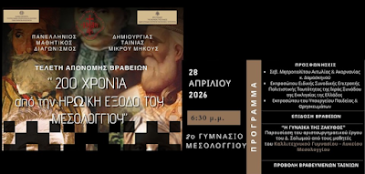 Τρίτη 28 Απριλίου :Πανελλήνιος Μαθητικός Διαγωνισμός Ταινίας Μικρού Μήκους για τα 200 χρόνια από την Έξοδο του Μεσολογγίου -τελετή βράβευσης